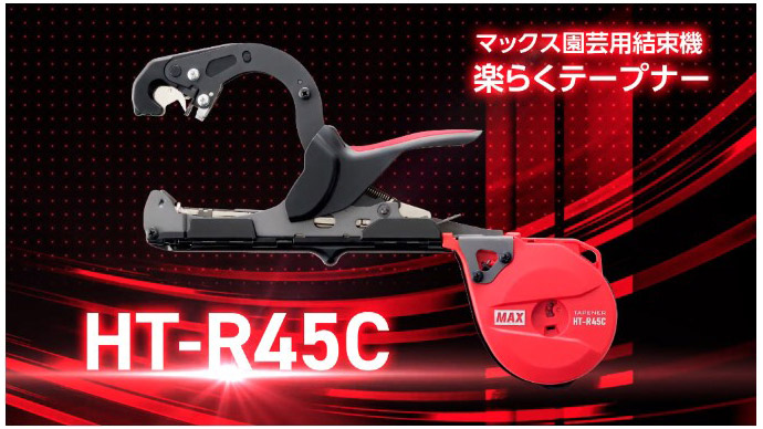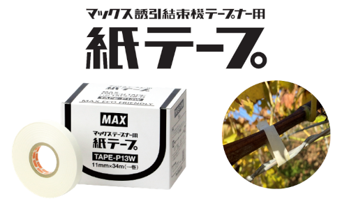マックス誘引結束機テープナーは、茎やつるを支柱や番線に、テープを回して片手でホッチキス留めを行うハンドツールです。